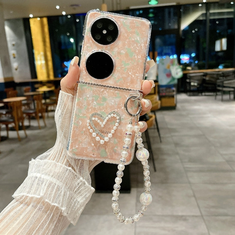 - 1x Funda para Huawei P50 con patrón de corazón y textura de concha nacarada con pulsera (Rosa)
