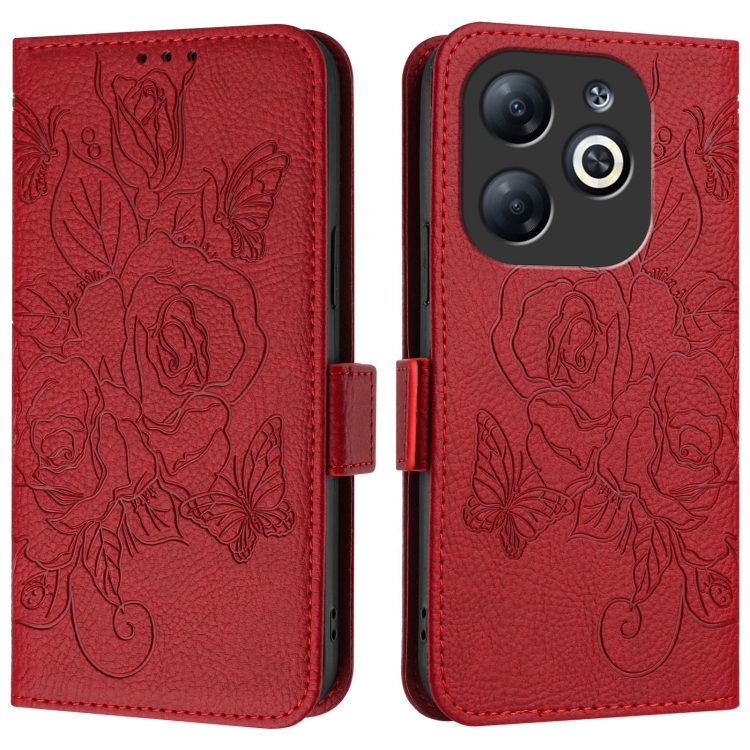 Funda de Cuero Antirrobo RFID para Infinix Smart 8 con Rosa en Relieve (Rojo)
