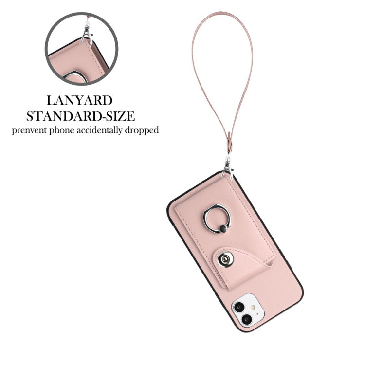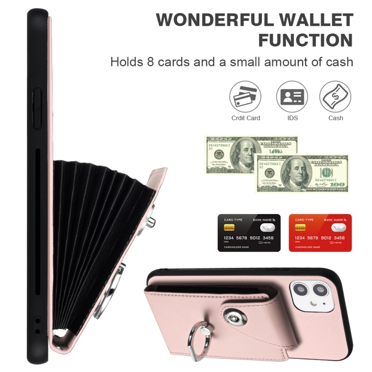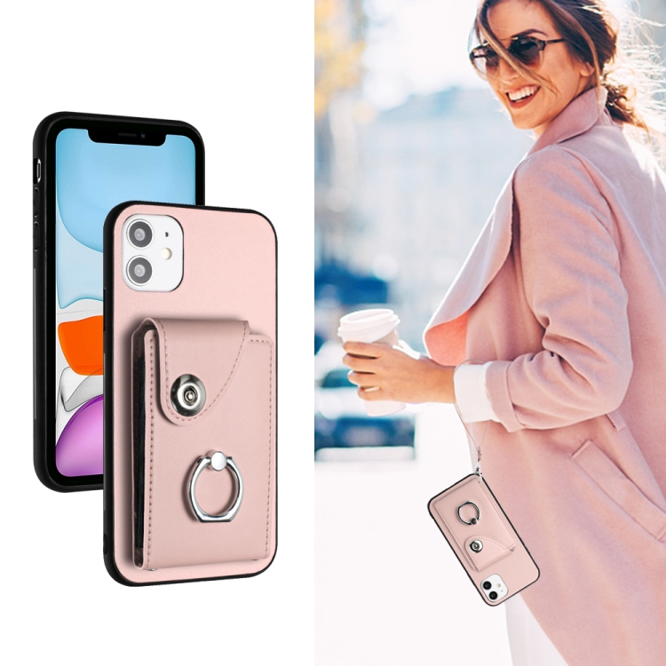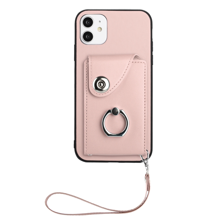 Funda para Teléfono iPhone 11 Pu con Soporte para Anillo y Bolsa para Tarjeta con Cordón (Rosa)