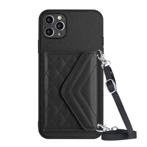 Estuche para Teléfono iPhone 11 Pro Rfid con Bolsa para Tarjetas Textura Rómbica y Cordón Largo (Negro)