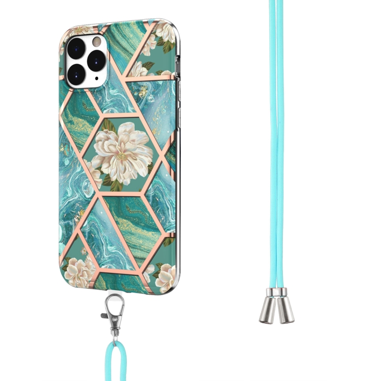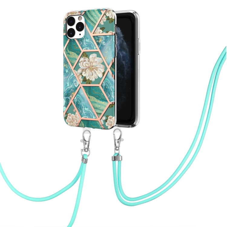 Estuche TPU para iPhone 11 Pro Galvanoplastia Empalme Mármol Patrón de Flores a Prueba de Golpes con Cordón (Flor Azul)