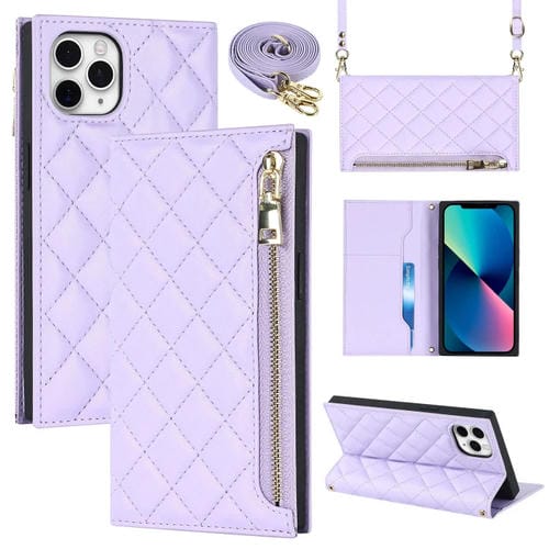 Funda de Cuero para iPhone 11 Pro Max Grid Texture con Lanyard y Cremallera (Púrpura)
