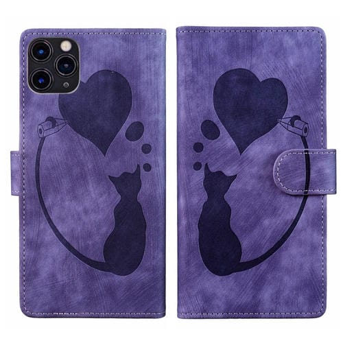 Funda para iPhone 11 Pro Max Pen Heart Cat de Cuero En Relieve (Púrpura)