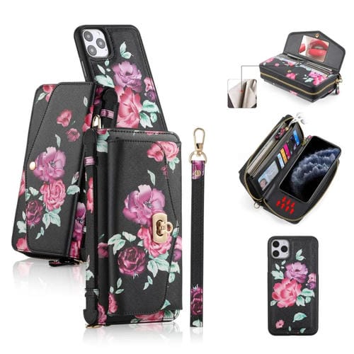 Funda de Cuero Pola Flower para iPhone 11 Pro con Billetera Cruzada Multifuncional y Cremallera (Negro)