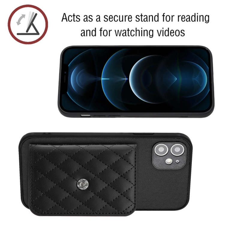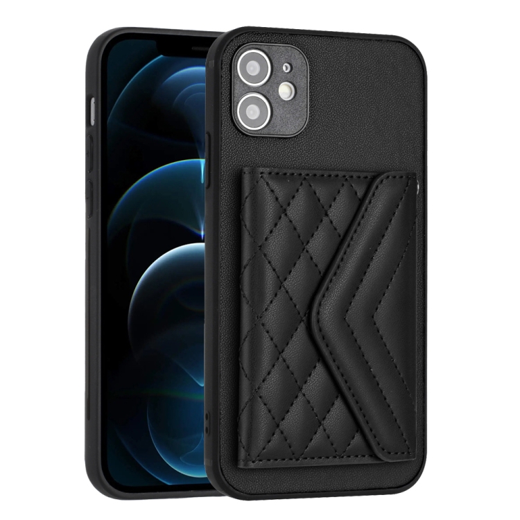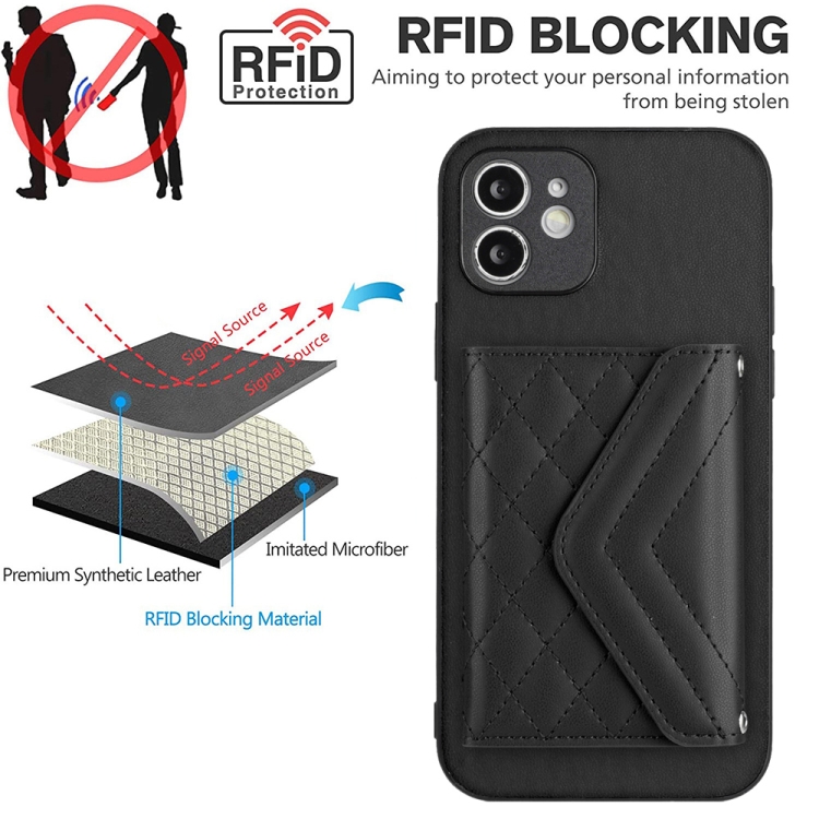 Estuche para Teléfono iPhone 12 Rfid con Bolsa para Tarjetas Textura Rómbica y Cordón Largo (Negro)