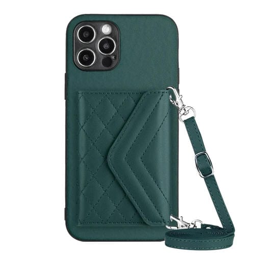 Estuche para Teléfono iPhone 12 Pro Rfid con Bolsa para Tarjetas Textura Rómbica y Cordón Largo (Verde)