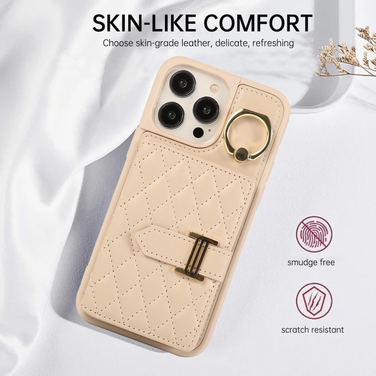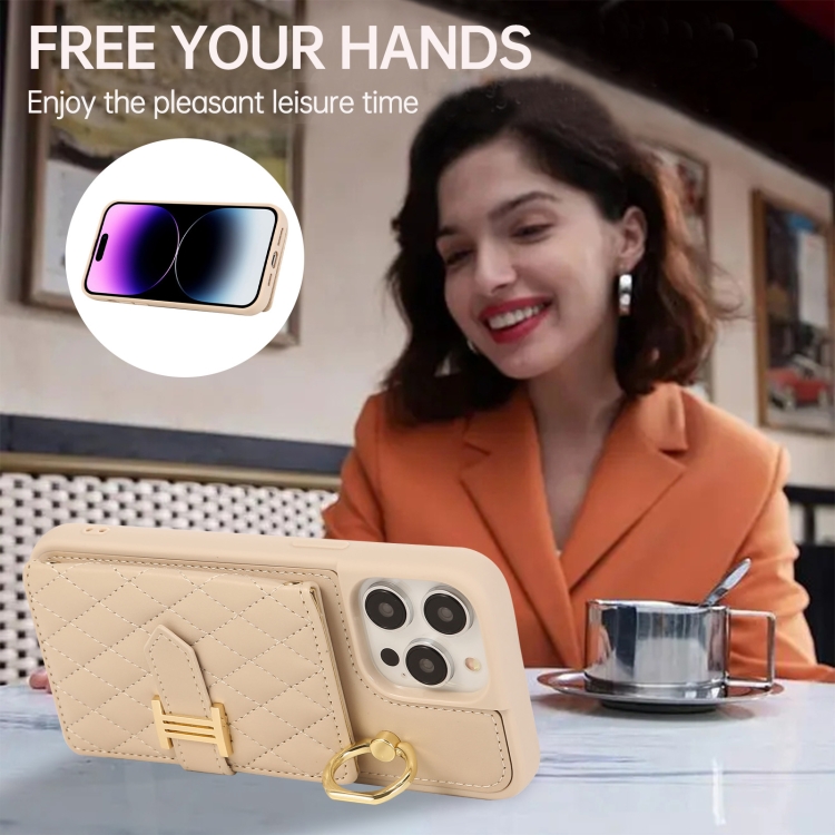 Bolsa de Tarjeta Horizontal Funda para Teléfono iPhone 13 con Soporte de Anillo y Cordón Doble (Beige)