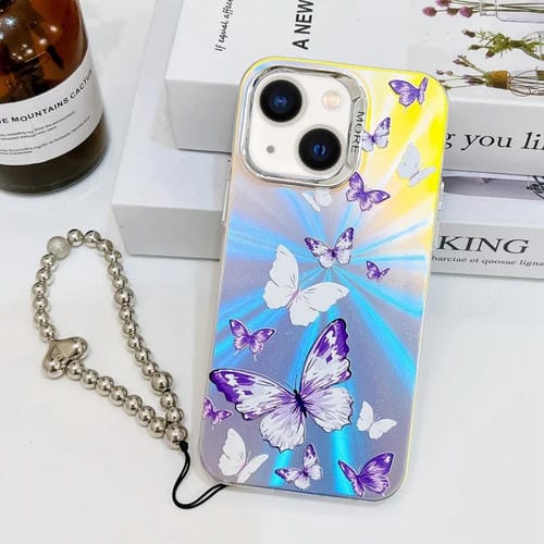 For iPhone 13 Electroplating Laser Butterfly Phone Case with Wrist Strap (AB6 White Purple Butterflies)