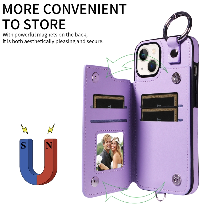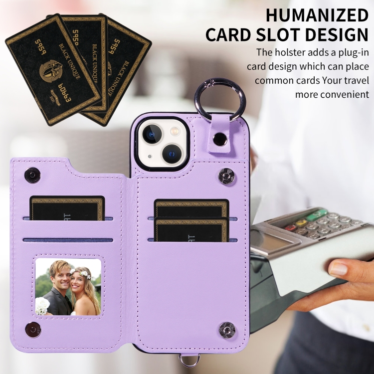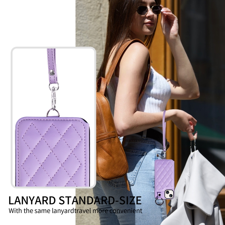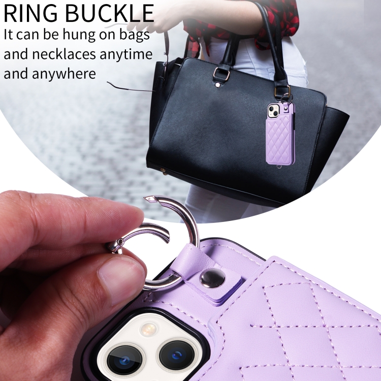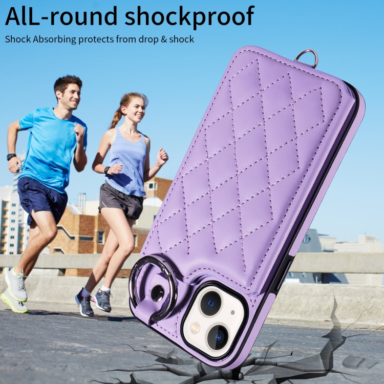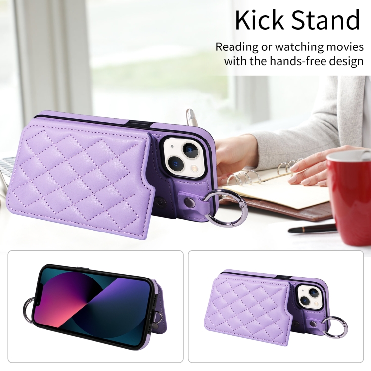 Funda para Teléfono iPhone 13 con Bolsa para Tarjetas Textura Rómbica y Cordón Corto (Púrpura)