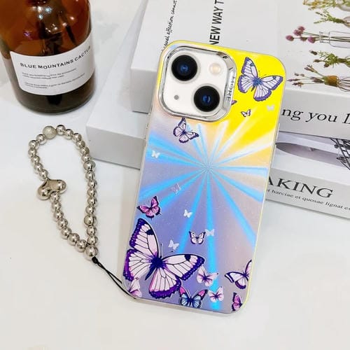 For iPhone 13 Electroplated Laser Butterfly Phone Case with Wrist Strap (AB3 Purple Butterflies)
