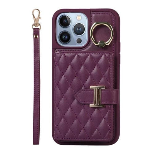 Funda para iPhone 13 Pro Max Horizontal Card Bag Ring Holder con Doble Cordón (Morado Oscuro)