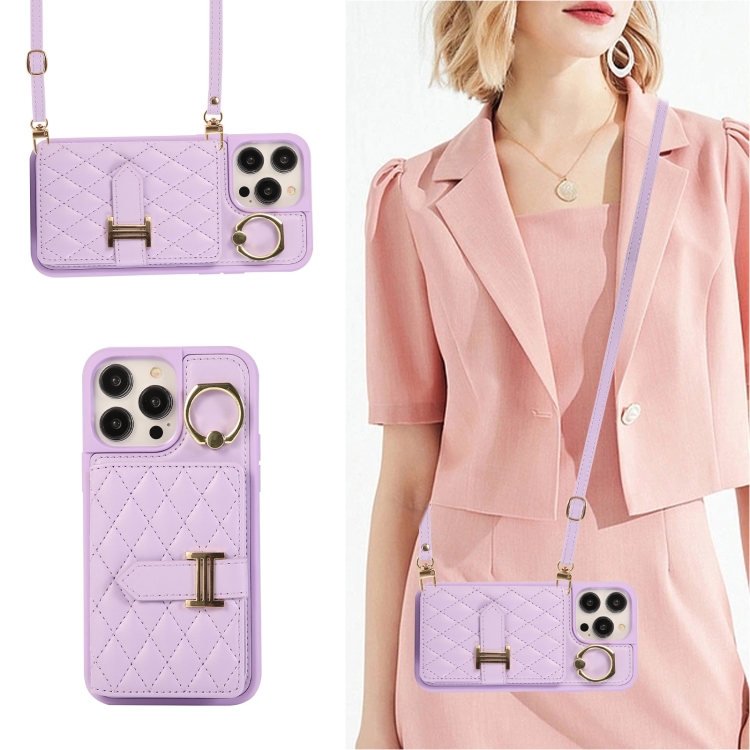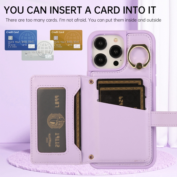 Funda para iPhone 13 Pro Max Horizontal Card Bag Ring Holder con Doble Cordón (Púrpura)