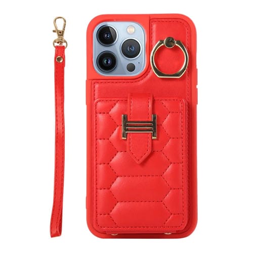 Funda para teléfono iPhone 13 Pro Max Vertical Card Bag Ring Holder con doble cordón (Rojo)