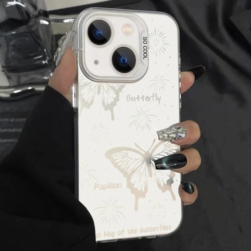 For iPhone 14 Hybrid TPU PC Phone Case with Silver Painting (White Hollow Butterfly)