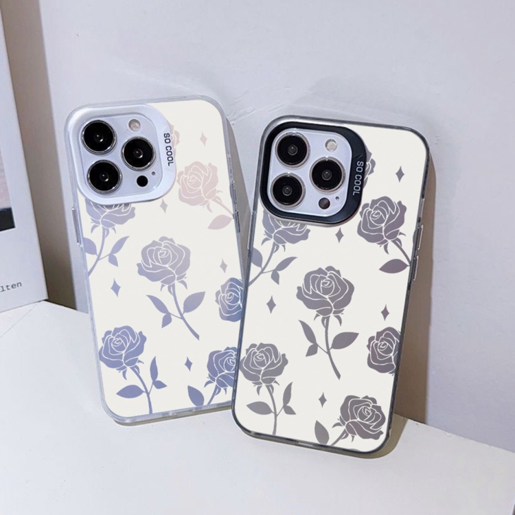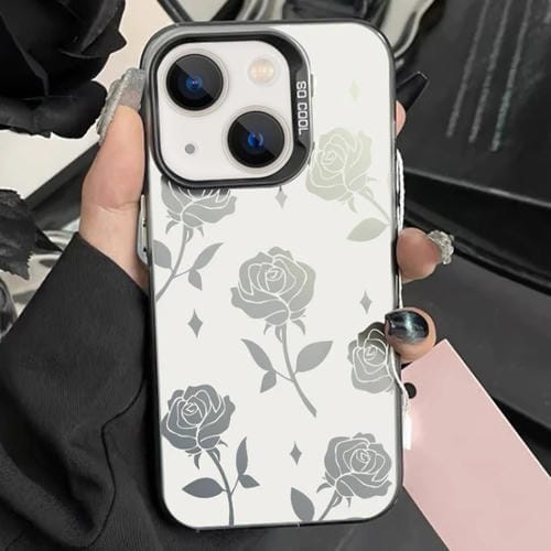 For iPhone 14 Hybrid TPU PC Phone Case with Silver Painting (Black Rose Hollow)