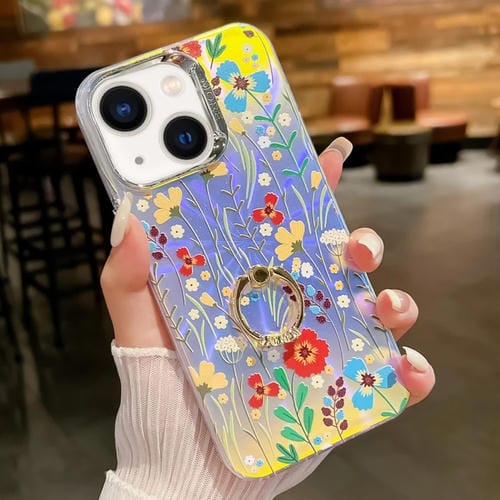 Caja de teléfono TPU para iPhone 14 con soporte de anillo y flor láser de galvanoplastia (Flor Ah6)