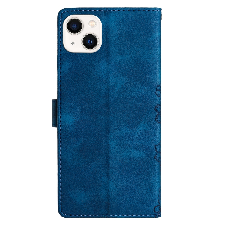 Funda para Teléfono PU iPhone 14 Sensación de Piel Mariposa y Flor de Cerezo (Azul)