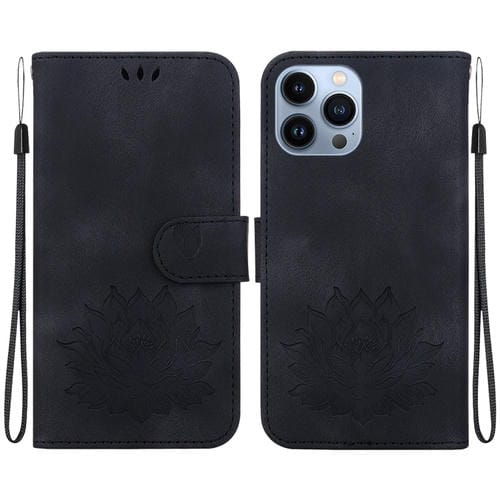 Funda de Cuero para iPhone 14 Pro con Relieve de Loto (Negro)