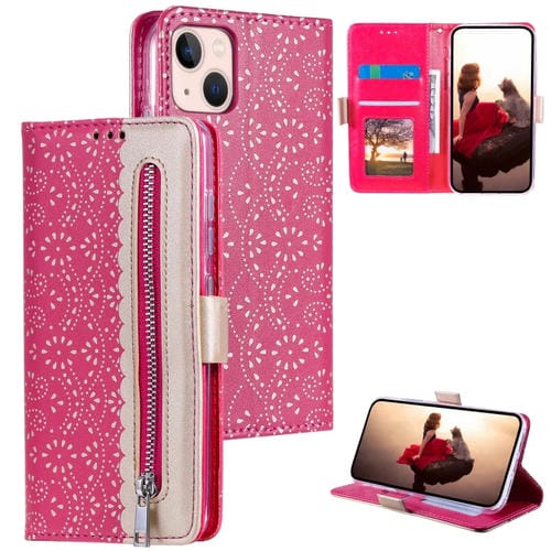 For iPhone 15 Double Button Zipper Leather Case with Lace Pattern and Lanyard (Rose Red)