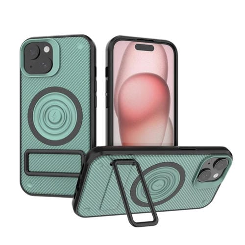 Funda para Teléfono iPhone 15 PC + TPU con Textura de Fibra de Carbono y Soporte de Metal (Verde)