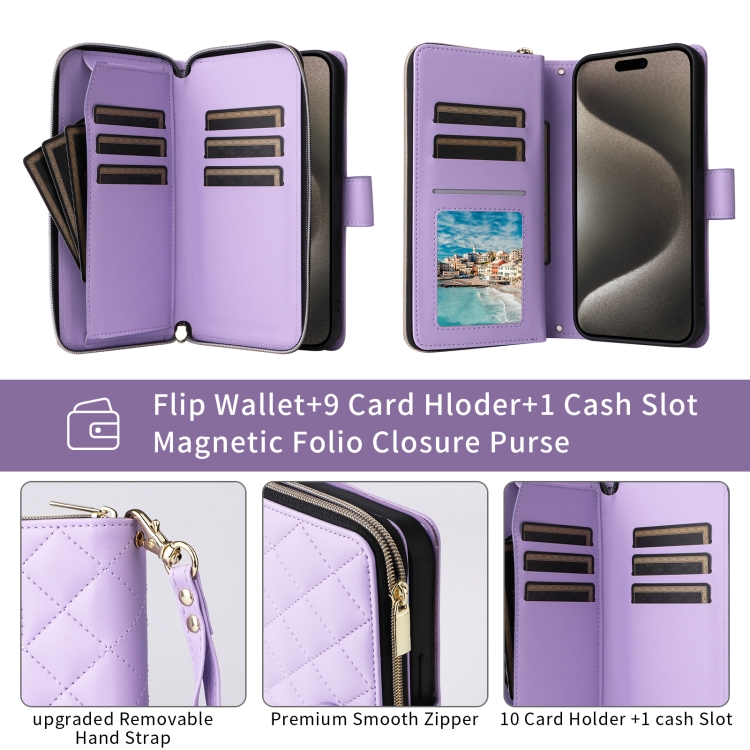 Funda Cruzada de Cuero para iPhone 15 Plus y 14 Plus con Hebilla de Torre y Cremallera Rómbica con Cordón (Púrpura)