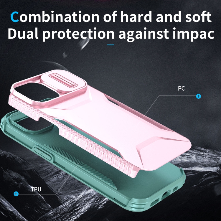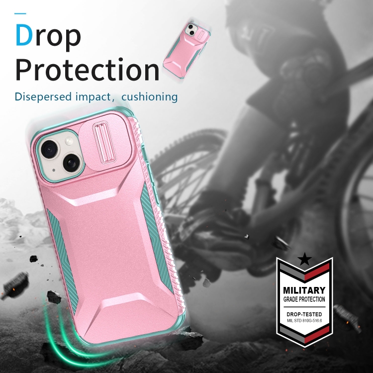 Estuche para Teléfono iPhone 15 Plus con Escudo Deslizante (Rosa + Gris Verde)