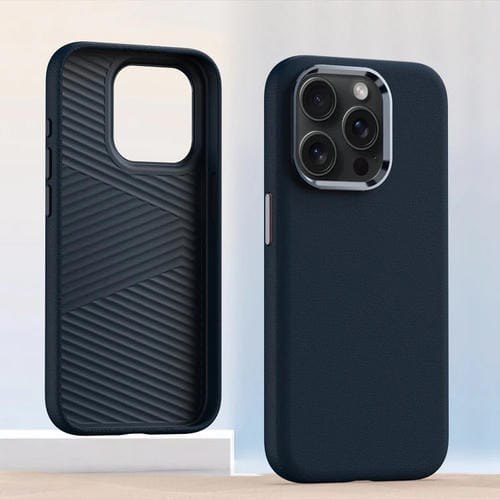 Estuche para Teléfono iPhone 15 Pro Cuero a Prueba de Golpes con Marco de Lente de Metal (Azul)