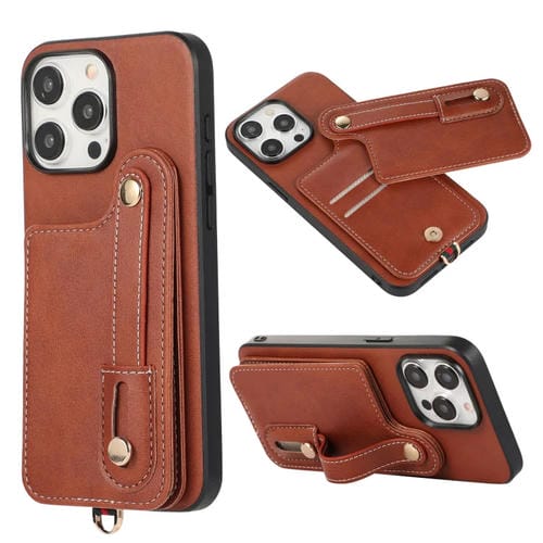 For iPhone 15 Pro Max 03 RFID Card Bag Cowhide Texture PU Phone Case (Brown)