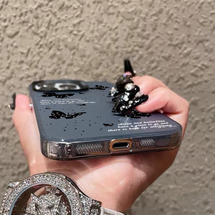 Caja de Teléfono Híbrida TPU para PC iPhone 15 Pro Max Pintura Plateada (Mariposa de Tinta Negra)