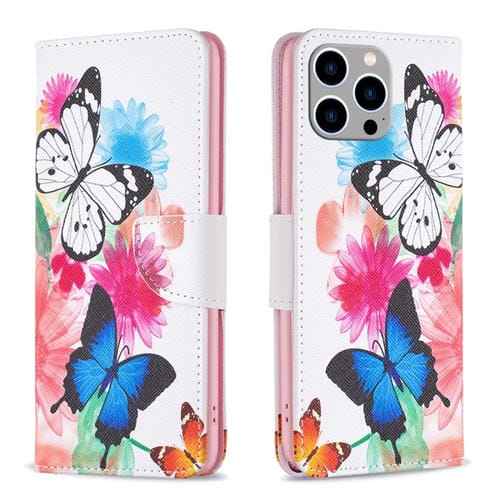 Estuche para Teléfono iPhone 15 Pro Max Cuero con Patrón de Dibujo Coloreado (Mariposas)