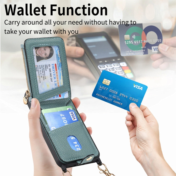 For iPhone 15 Pro Max Phone Case with Zipper Leather Back Cover and Cross Love (Green)