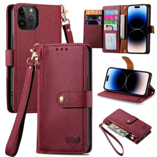 For iPhone 15 Pro Max Love Zipper Lanyard Leather Phone Case(Red)