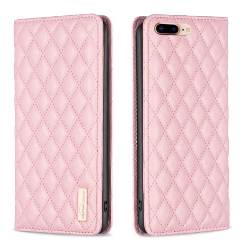 For iPhone 8 Plus / 7 Plus Diamond Lattice Magnetic Leather Flip Phone Case (Pink)