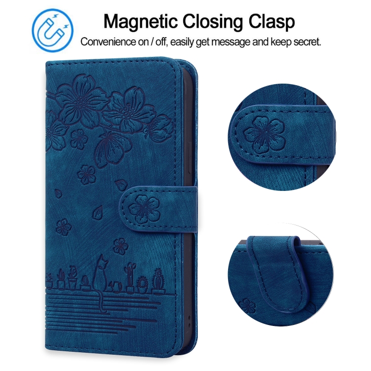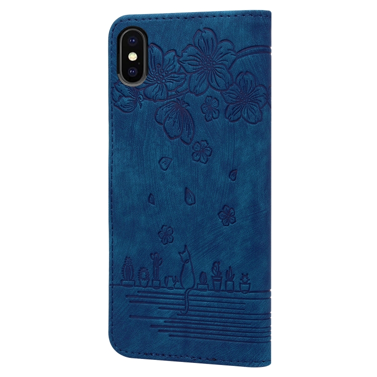Estuche de Cuero para iPhone X Xs Cartoon Sakura Cat en Relieve (Azul Real)