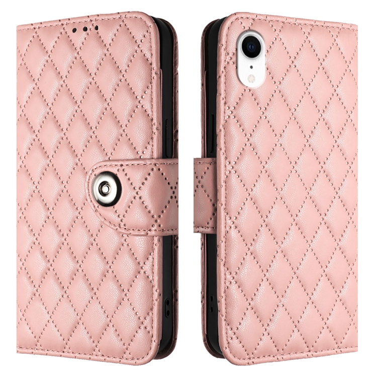 Funda de Cuero para iPhone Xr con Tapa y Textura Rómbica con Cordón (Rosa Coral)