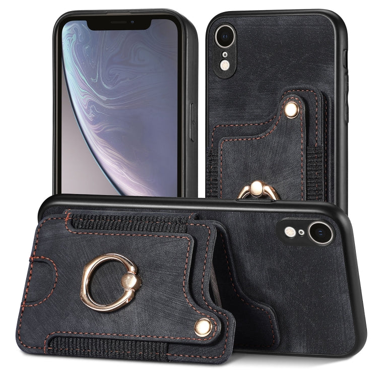Funda para iPhone Xr Retro Skin-Feel Ring Multi-Card Wallet Phone Case (Negro)