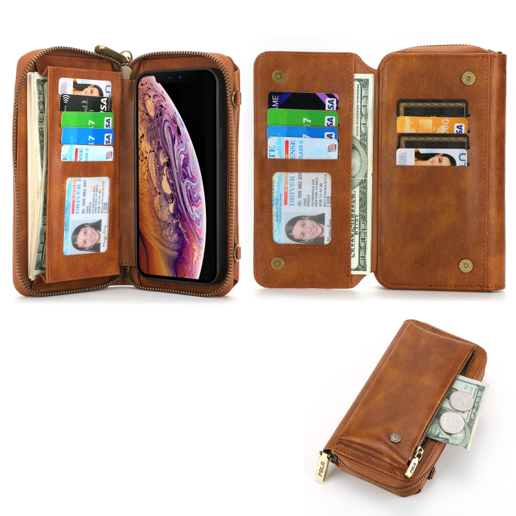 Funda de Teléfono Cuero iPhone Xs con Billetera y Cremallera Multifuncional Cruzada (Marrón)