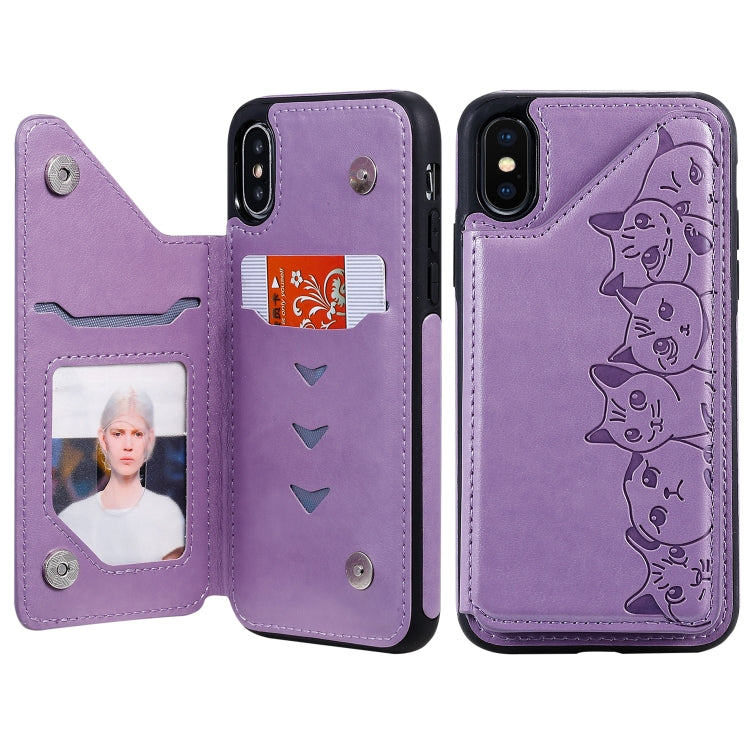 Estuche protector Six Cats para iPhone Xs con patrón de relieve, soporte, ranuras para tarjetas y marco de fotos (Púrpura)
