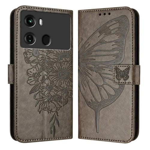Funda de Cuero para Itel P40 con Mariposa en Relieve (Gris)