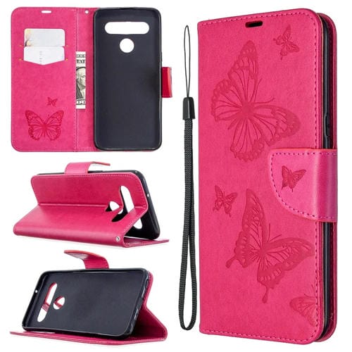 Funda de Cuero LG K61 Two Butterflies con Tapa Horizontal, Soporte, Ranura para Tarjeta, Billetera y Cordón (Rose Red)