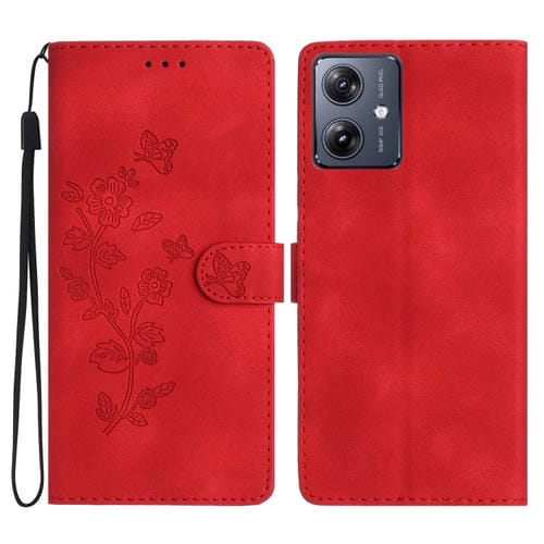 Funda de Cuero para Motorola Moto G14 4G con Estampado de Mariposa y Flor (Rojo)