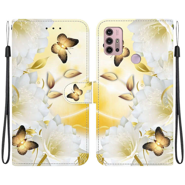 Estuche de Cuero para Motorola Moto G30 G10 G20 con Dibujo Coloreado y Textura de Cristal (Epiphyllum Mariposa Dorada)