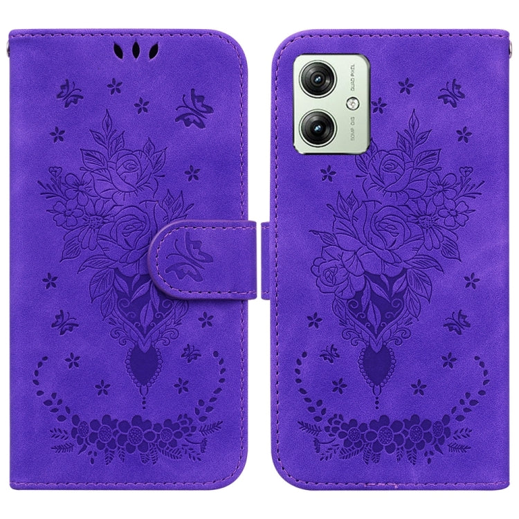 Funda de Cuero para Motorola Moto G54 con Relieve de Mariposa y Rosa (Púrpura)