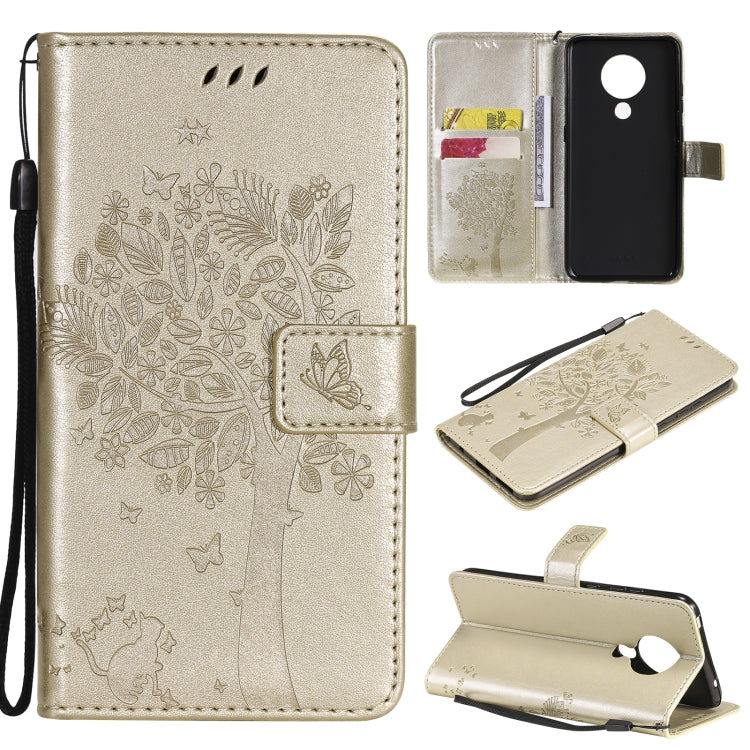 Para Nokia 5.3 Árbol y gato Patrón de impresión prensada Funda de cuero PU de la PU con soporte y ranuras para tarjetas y cordones y cordones (oro)