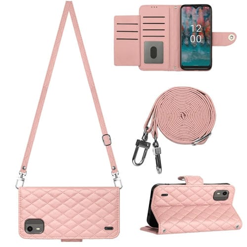 Funda de Cuero para Nokia C12 con Tapa, Textura Rómbica y Cordón Largo (Rosa Coral)
