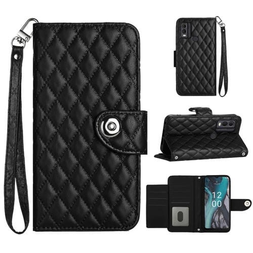Funda para Nokia C22 de Cuero con Tapa, Textura Rómbica y Cordón (Negro)