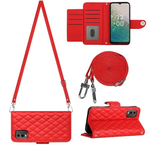 Funda de Cuero para Nokia C32 con Tapa, Textura Rómbica y Cordón Largo (Rojo)