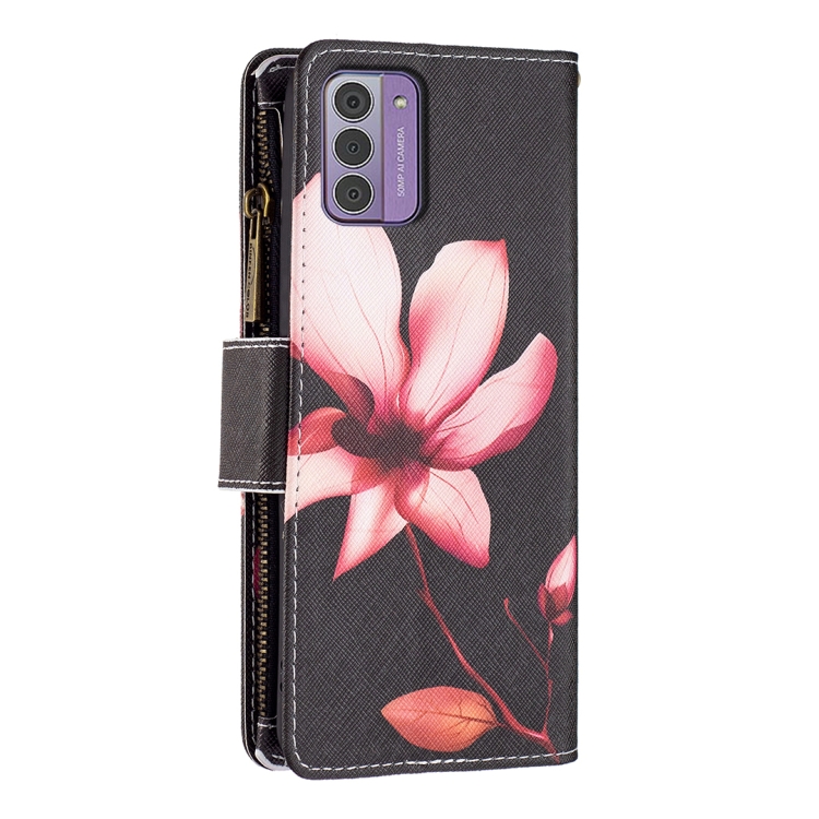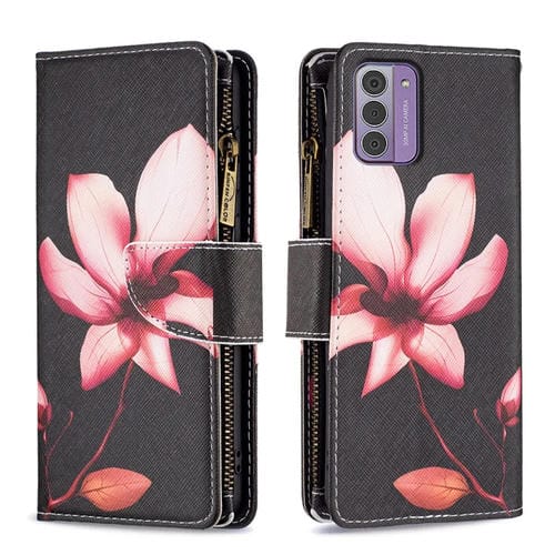 Estuche para Teléfono Nokia G42/G310 de Cuero con Cremallera y Patrón Lotus Coloreado