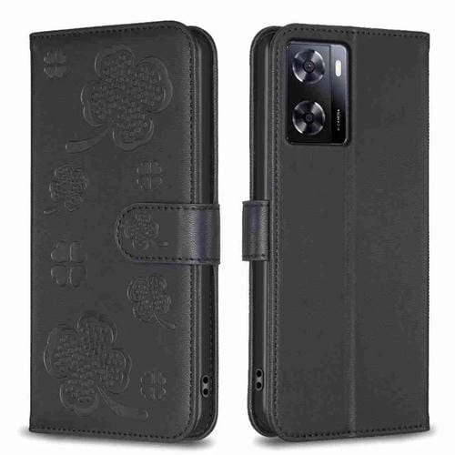 Para Oppo A57 4G Funda de Cuero con Relieve de Cuatro Hojas (Negro)