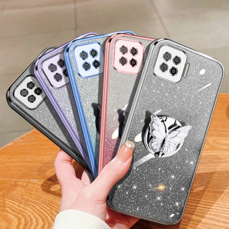 Para Oppo F17 Funda para Teléfono de TPU con Soporte de Mariposa con Brillo Degradado Plateado (Azul Sierra)